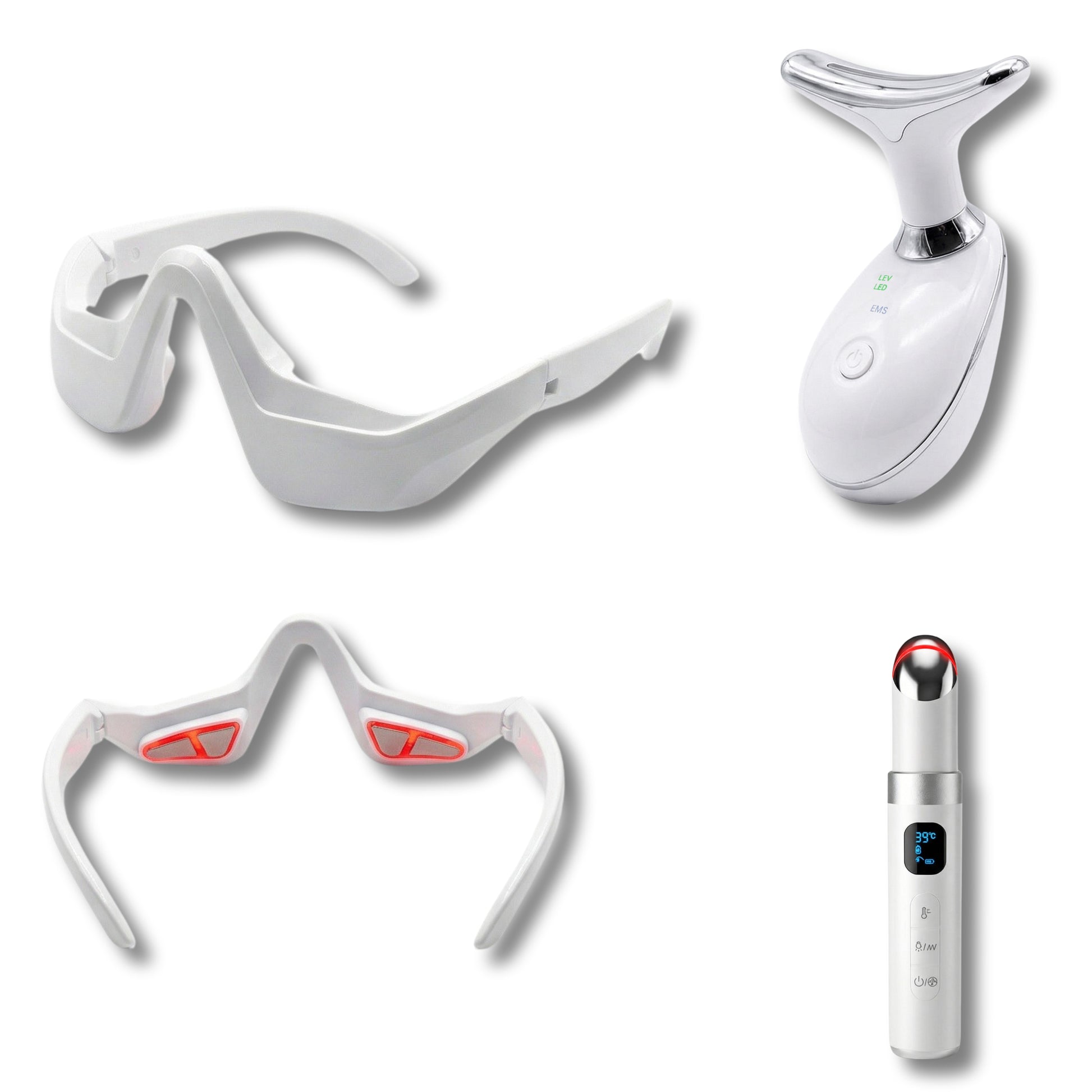 Le coffret intègre ensuite deux niveaux d’action sur le regard. Le Masque Oculaire Professionnel est idéal pour un effet défatiguant rapide : ses programmes EMS, vibrations et lumière rouge stimulent la microcirculation sous-oculaire, tonifient la zone et favorisent la diminution des poches, des cernes et des ridules. Le Soin Yeux Anti-Âge renforce l’action sur la fermeté et l’éclat grâce à la combinaison EMS + vibrations soniques + chaleur (38–45 °C) + LED, pour un contour des yeux plus lisse, plus ferme et visiblement revitalisé.